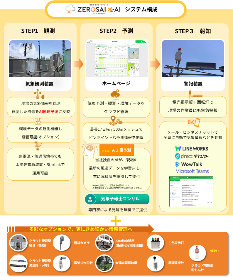 ZEROSAI X-AIは、1,000を超える建設現場で実績のある「自然災害防災システム ZEROSAI」の後継サービスとして、長年の現場ニーズを反映させながら、最新のAI技術を融合させた次世代プラットフォームです。