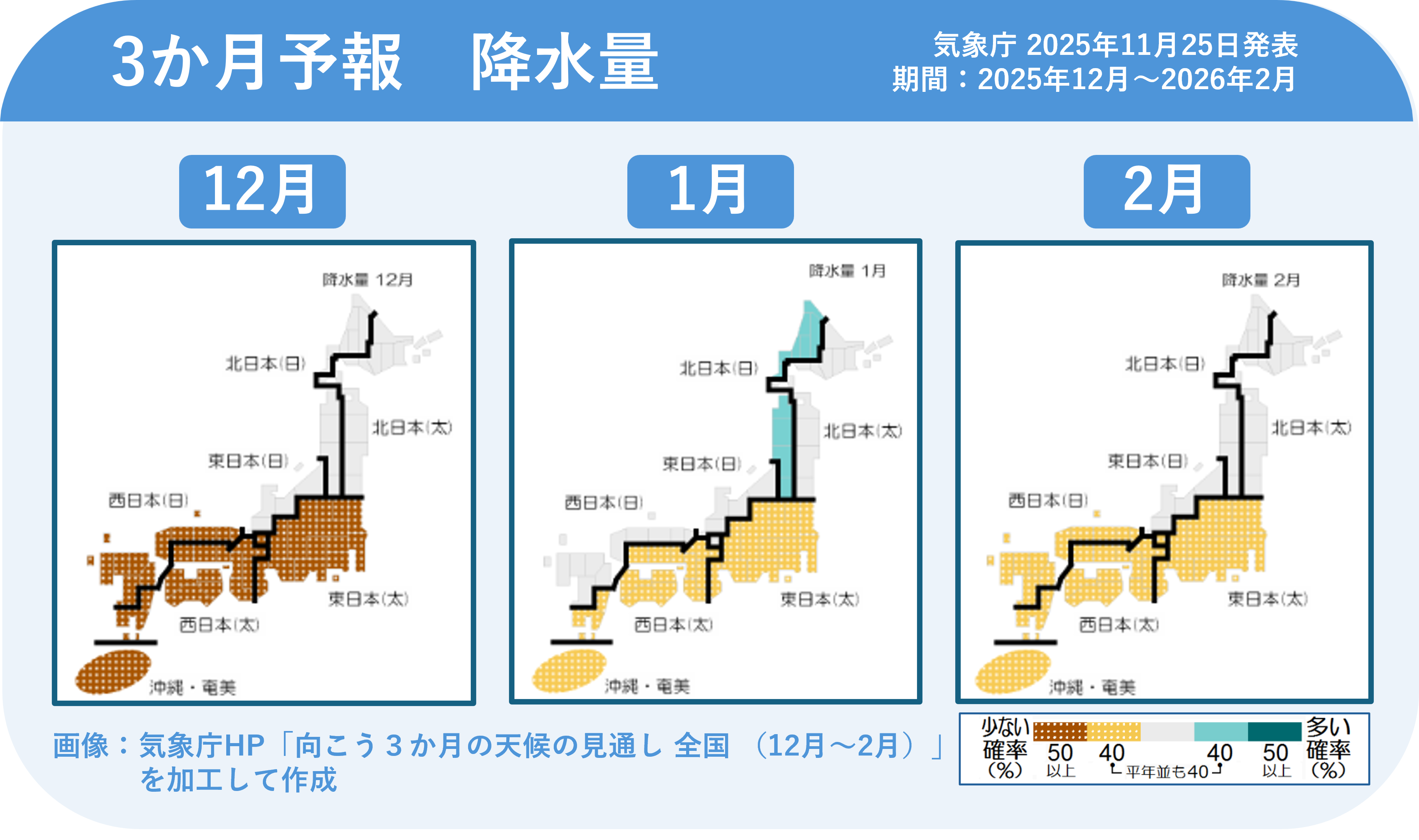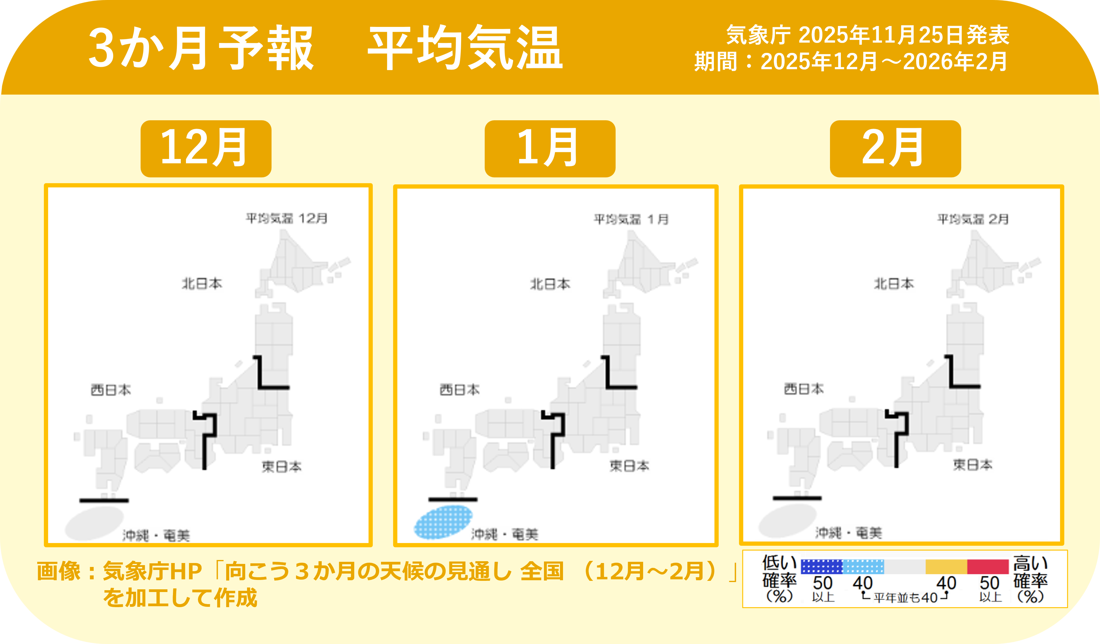 気象庁は11月25日(火)、12月から翌年2月にかけての3か月予報を発表しました。