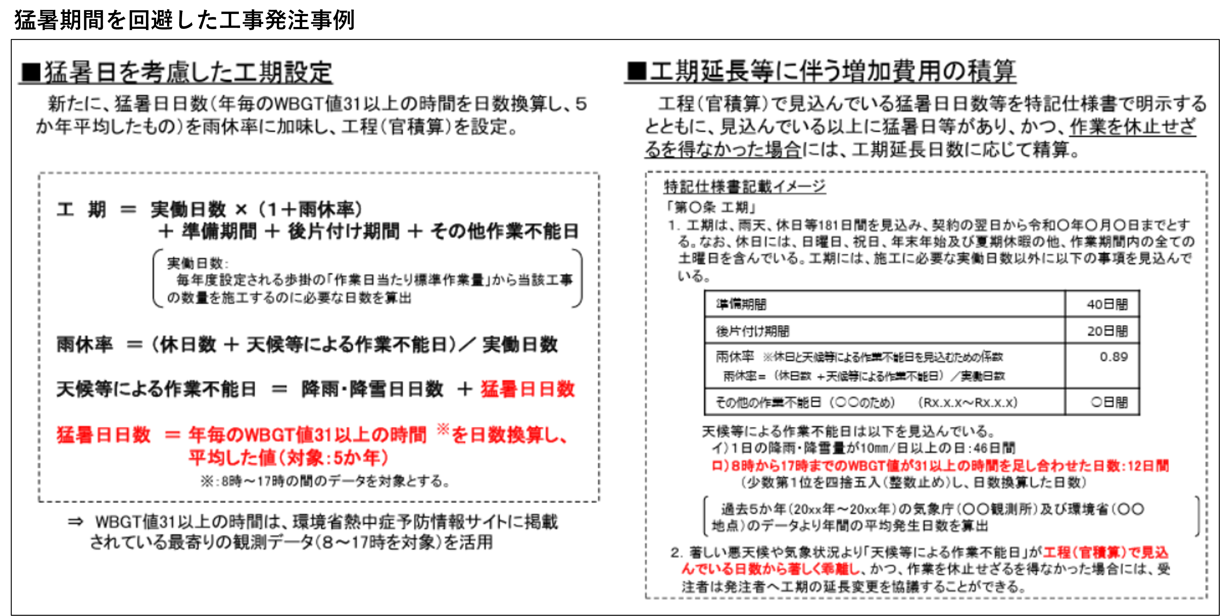 猛暑日を不稼働日として考慮する指針の改定や、猛暑期間を避けた発注(準備期間や工場製作に充てる等)を