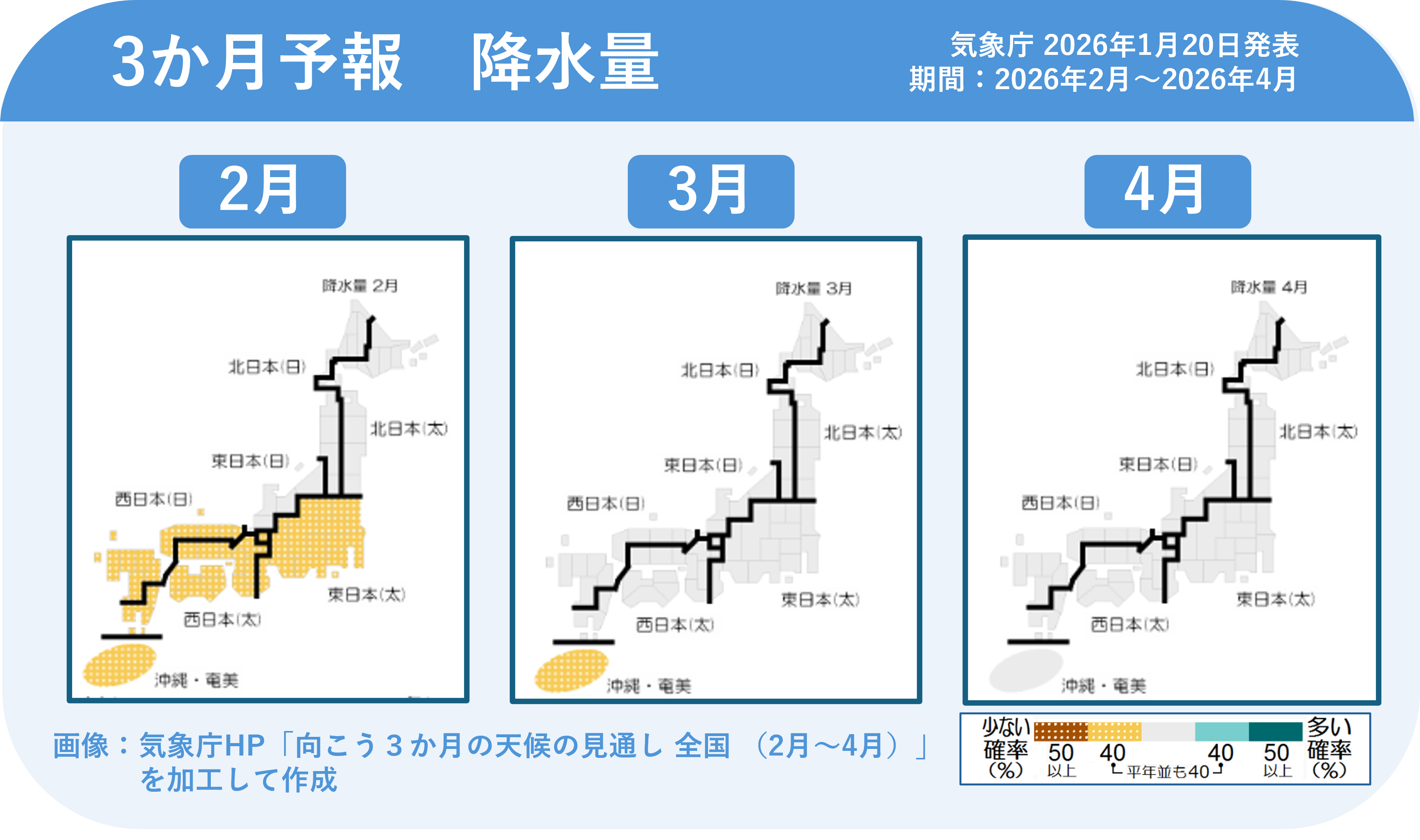 これらから、西日本や沖縄・奄美では降水量は平年並みか少ない予想です。北日本付近では、一時的に冬型の気圧配置が強まる可能性があるため、急な雪の強まりには引き続き注意が必要です。