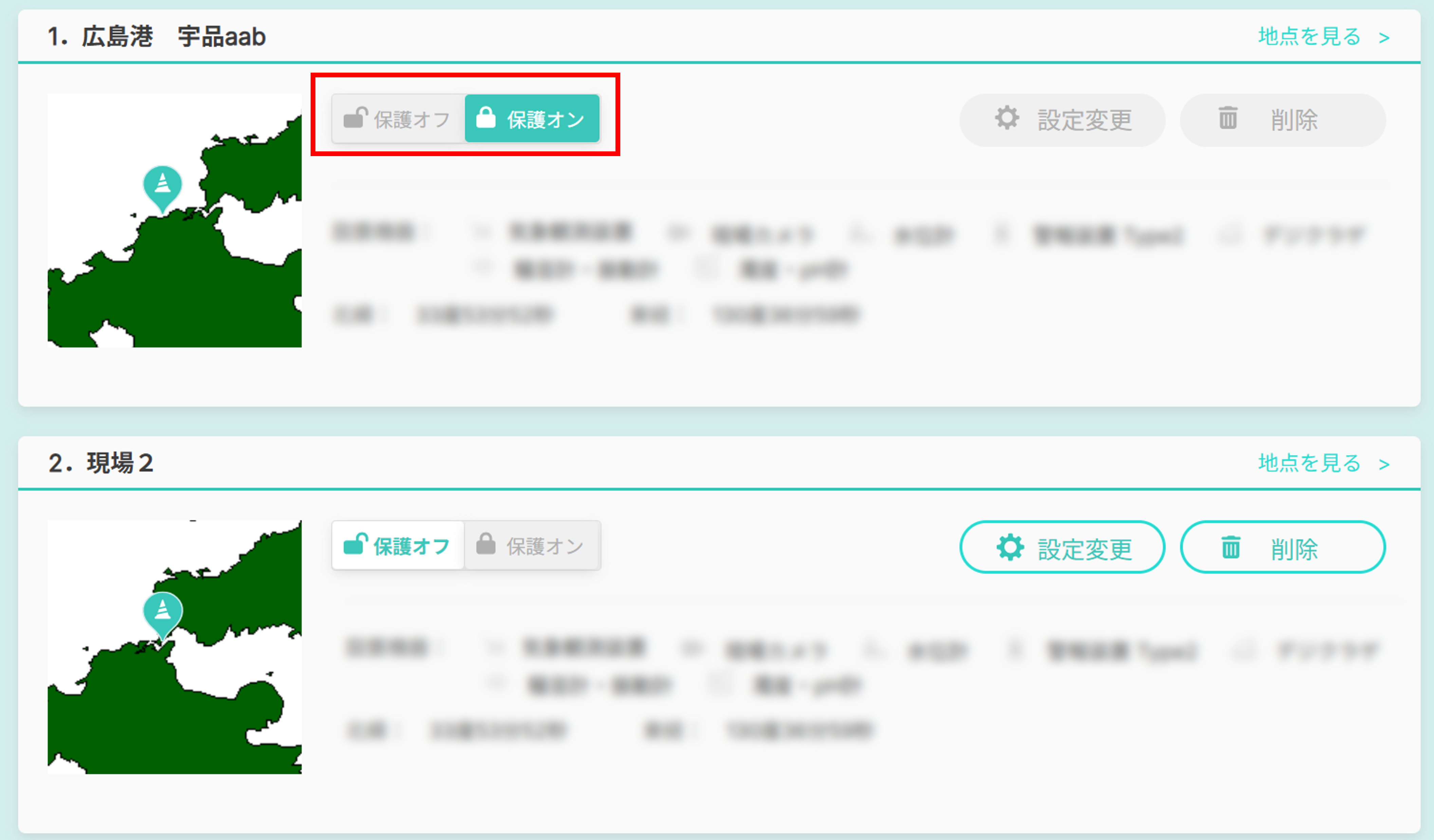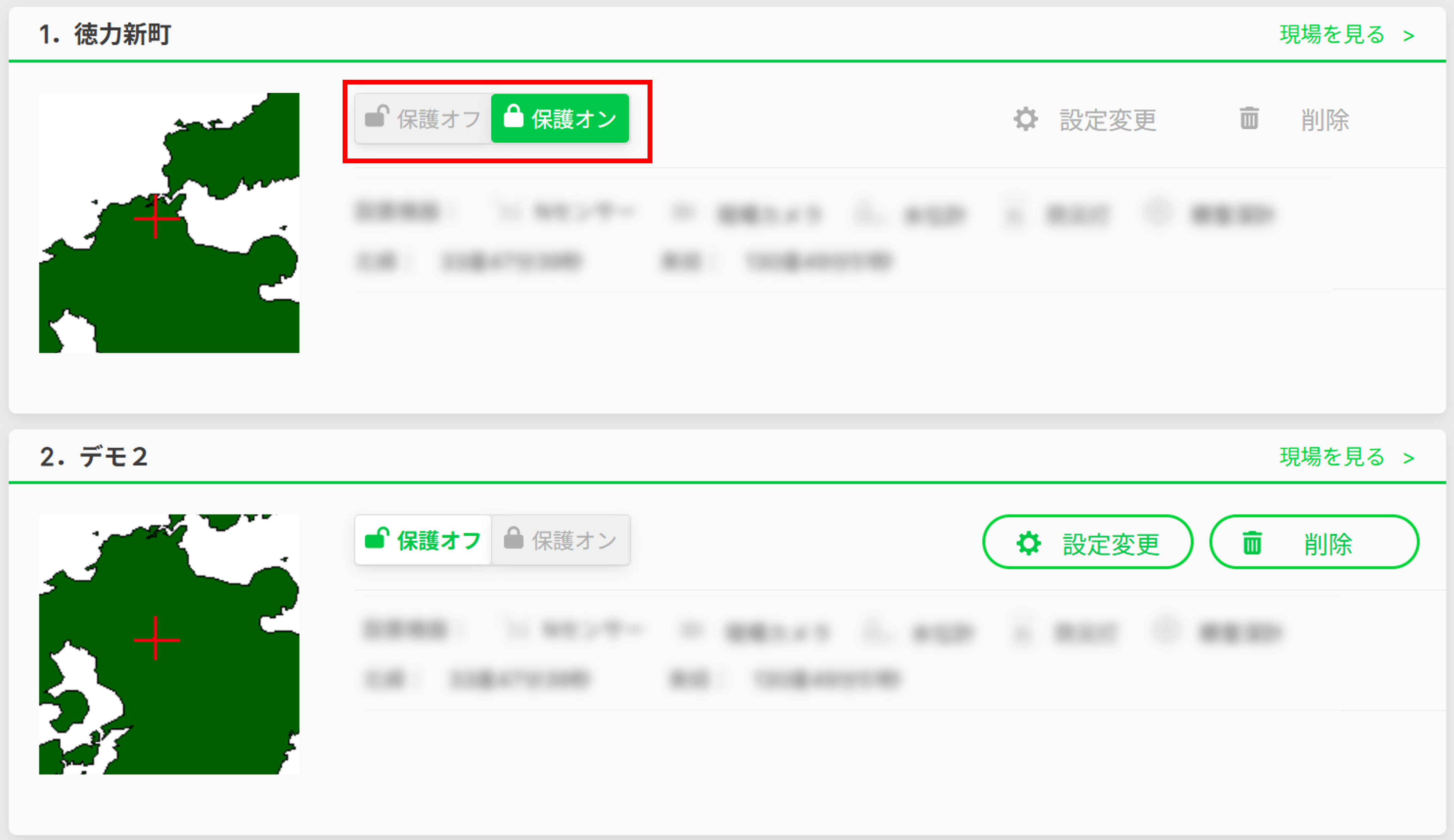 各現場(地点)の左上にあるスイッチをクリックして「保護オフ」にすることで、編集ができるようになります。